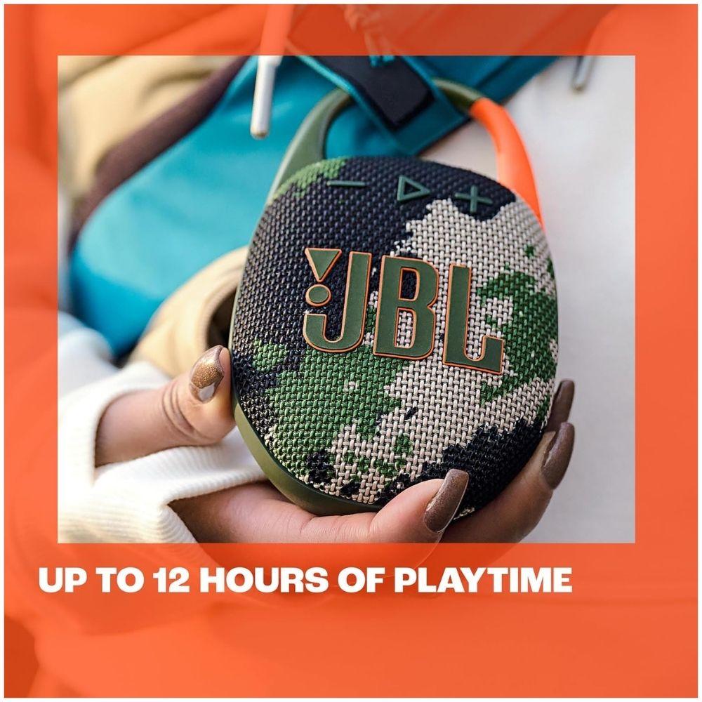 - يتميز مكبر صوت بلوتوث Clip 5 بصوت JBL Pro الجهير والمفعم بالحيوية، مدعوم بمشع سلبي لتقديم صوت جهوري غني ومرتفع بشكل فائق بالنسبة لحجمه. يمكنك تشغيل الموسيقى لاسلكيًا عبر البلوتوث حتى 12 ساعة متواصلة بشحنة واحدة، ويُتاح تمديد الوقت عند استخدام وضع Playtime Boost.