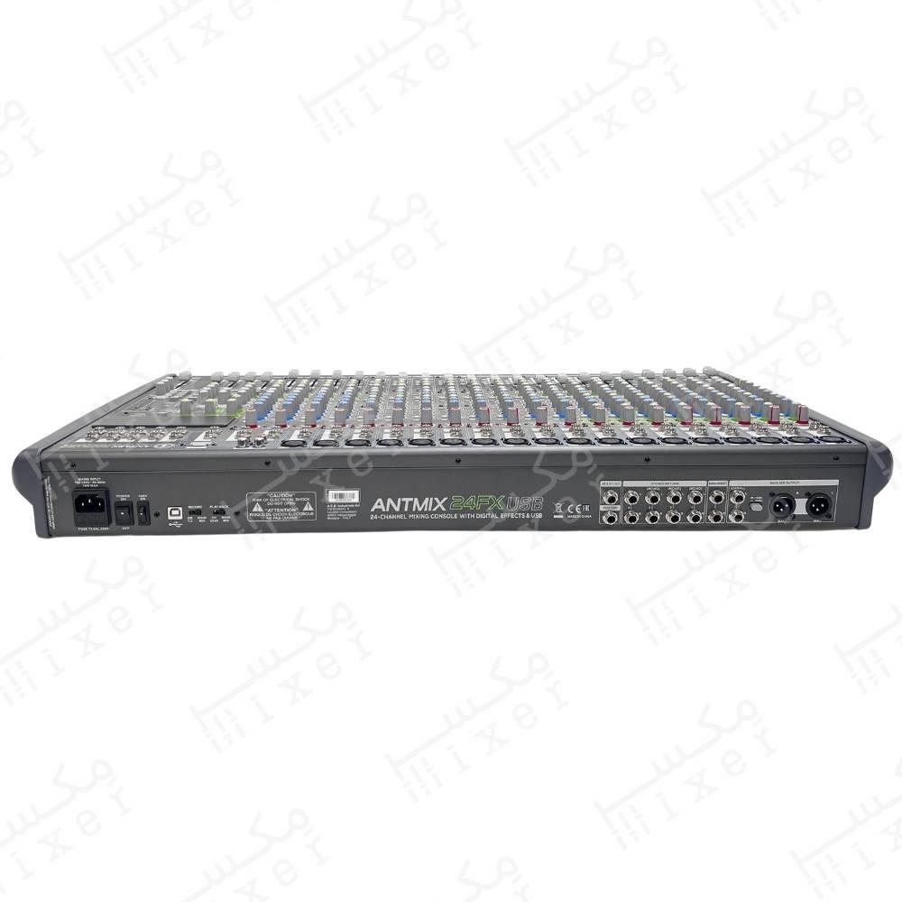 يحتوي مكسر الصوت ANTMIX 24FX على 24 قناة إدخال، بالإضافة إلى واجهة USB مدمجة تتيح توصيل الكمبيوتر مباشرة لتسجيل الأداء الصوتي أو تشغيل المسارات الصوتية مباشرة من الحاسوب. كما يدعم مكسر صوت بطاقات اختيارية مثل MPX 1624 و BTX 1624 التي توفر اتصالًا سلكيًا أو عبر البلوتوث مع أي جهاز تشغيل MP3.