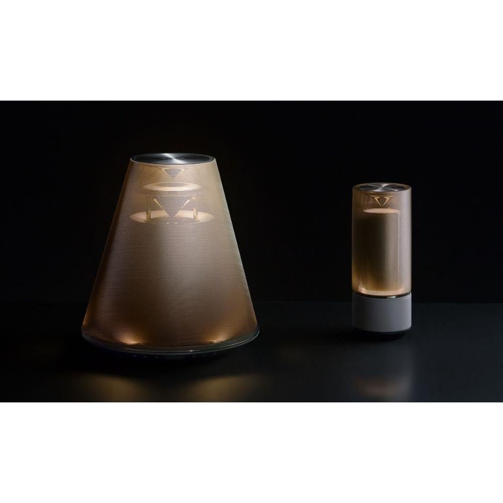 - تم تصميم مكبر صوت محمول ليكون رفيقك المثالي أينما كنت، سواء في غرفة المعيشة، بجوار النافذة، في ركنك الخاص أو حتى في الحديقة. بفضل حجمه المدمج وخاماته الفاخرة، يمنحك شعورًا بالدفء والراحة مع صوت محيطي 360 درجة موزع بالتساوي من خلال وحدتي سماعات مدمجتين أعلى وأسفل الجهاز.
