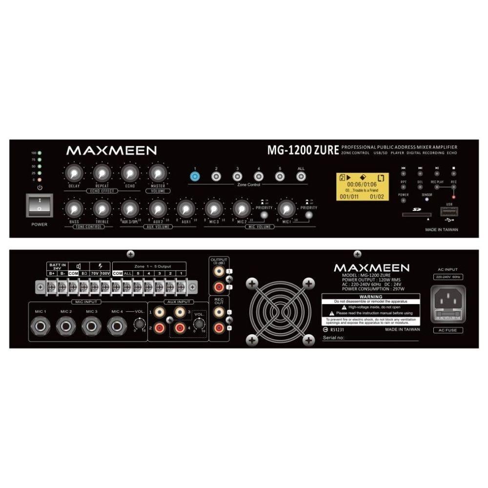 - تم تصميم مضخم الصوت Maxmeen MG-1200ZURE/B لتقديم تجربة صوت متكاملة تشمل التحكم بـ 5 مناطق صوتية مستقلة، مما يتيح توزيع الصوت حسب الحاجة. مع مداخل متعددة، دعم بلوتوث، تشغيل مباشر من USB/SD، وواجهة تحكم رقمية، يوفر هذا الجهاز حلاً مثاليًا لأنظمة الصوت متعددة المصادر والمخرجات، بالإضافة لنظام حماية داخلي يحافظ على استقرار الجهاز أثناء التشغيل.