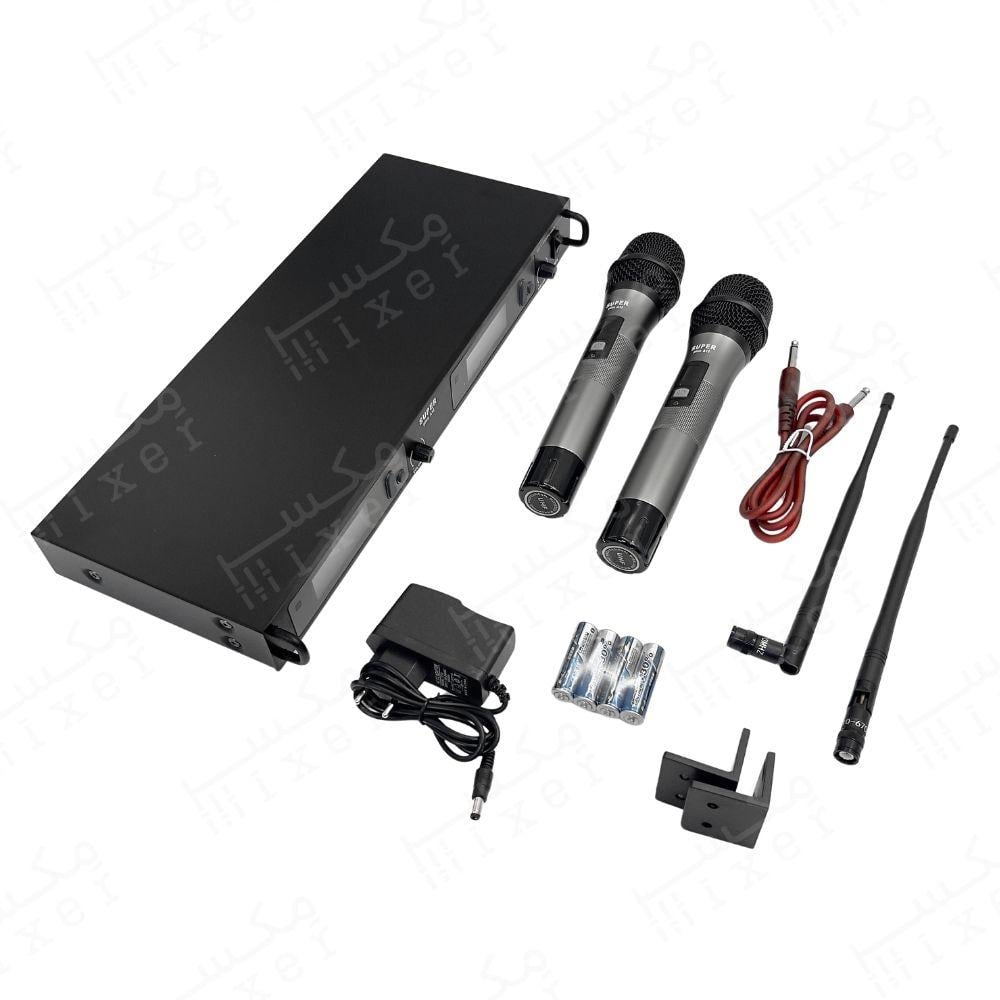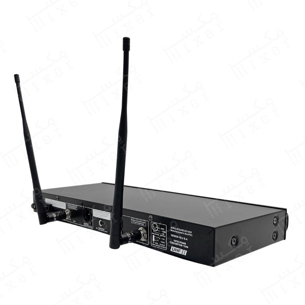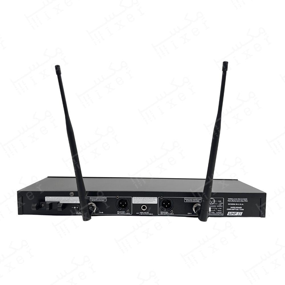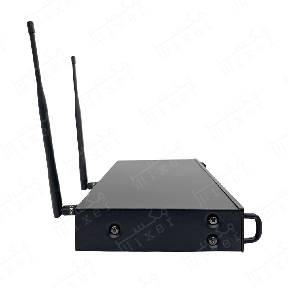 - ميكروفون يدوي لاسلكي يعتمد على ترددات UHF عالية الكفاءة التي توفر مدى إرسال ممتاز واستقرار عالي. يحتوي على أزرار تحكم متعددة لكل قناة (رفع/خفض التردد، مزامنة، تحكم في الصوت) بالإضافة إلى شاشة عرض LCD لكل قناة تعرض حالة التردد ومستوى الإشارة. يتميز كذلك بإخراج صوتي أمامي 6.3 مم لتوصيل مباشر بمكبرات الصوت أو أنظمة التسجيل.