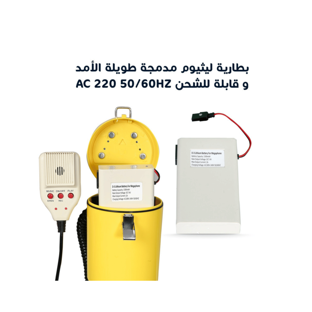 - البطارية القابلة للشحن تتيح لك استخدام الميجافون لفترة طويلة دون الحاجة إلى إعادة الشحن بشكل مستمر.